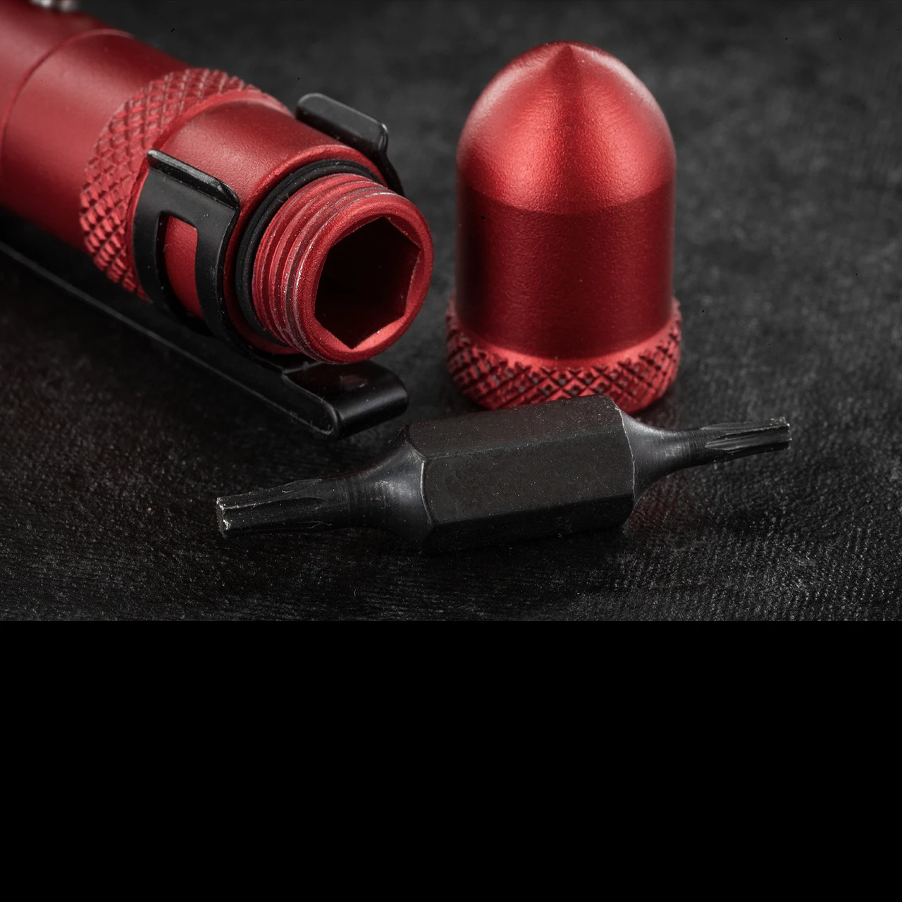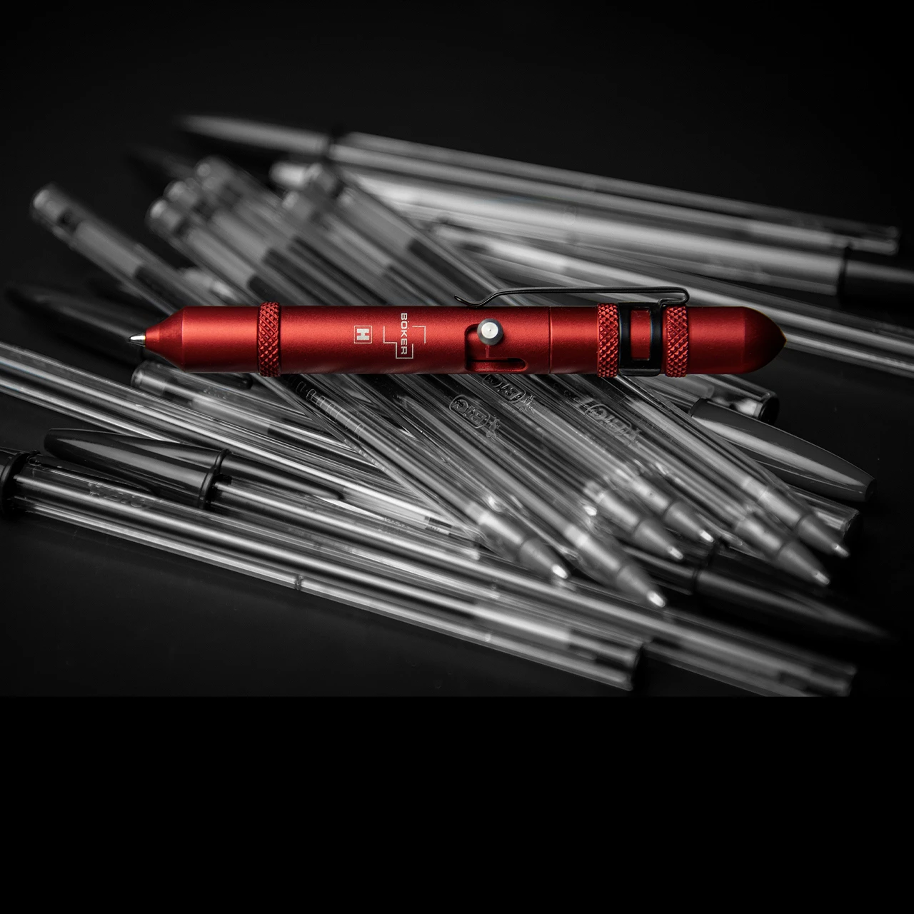 The Boker Plus Bit-Pen also counteracts the annoying clicks of nervous users of plastic ballpoint pens with the rich sound of the bayonet catch, which is made completely of metal. Thanks to the stable clip, the Tactical Pen always remains within reach. It is supplied with ink, compatible with the Lamy refill M-22 and is delivered with a double-ended Torx bit (T6 and T8).