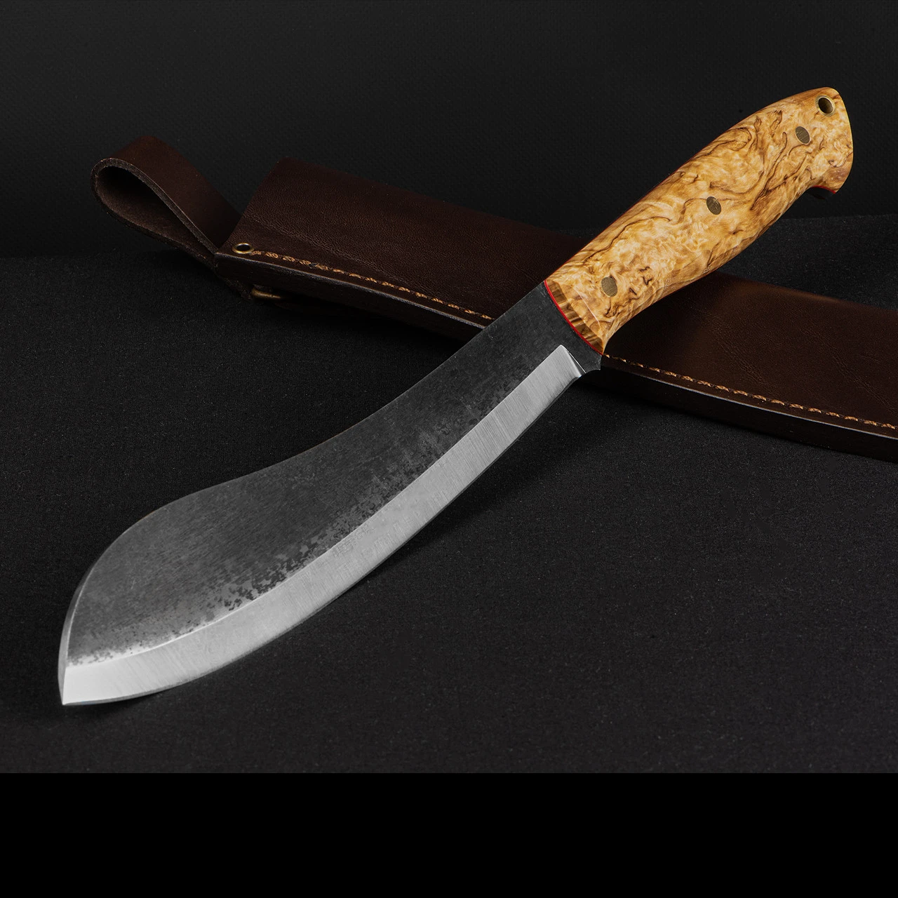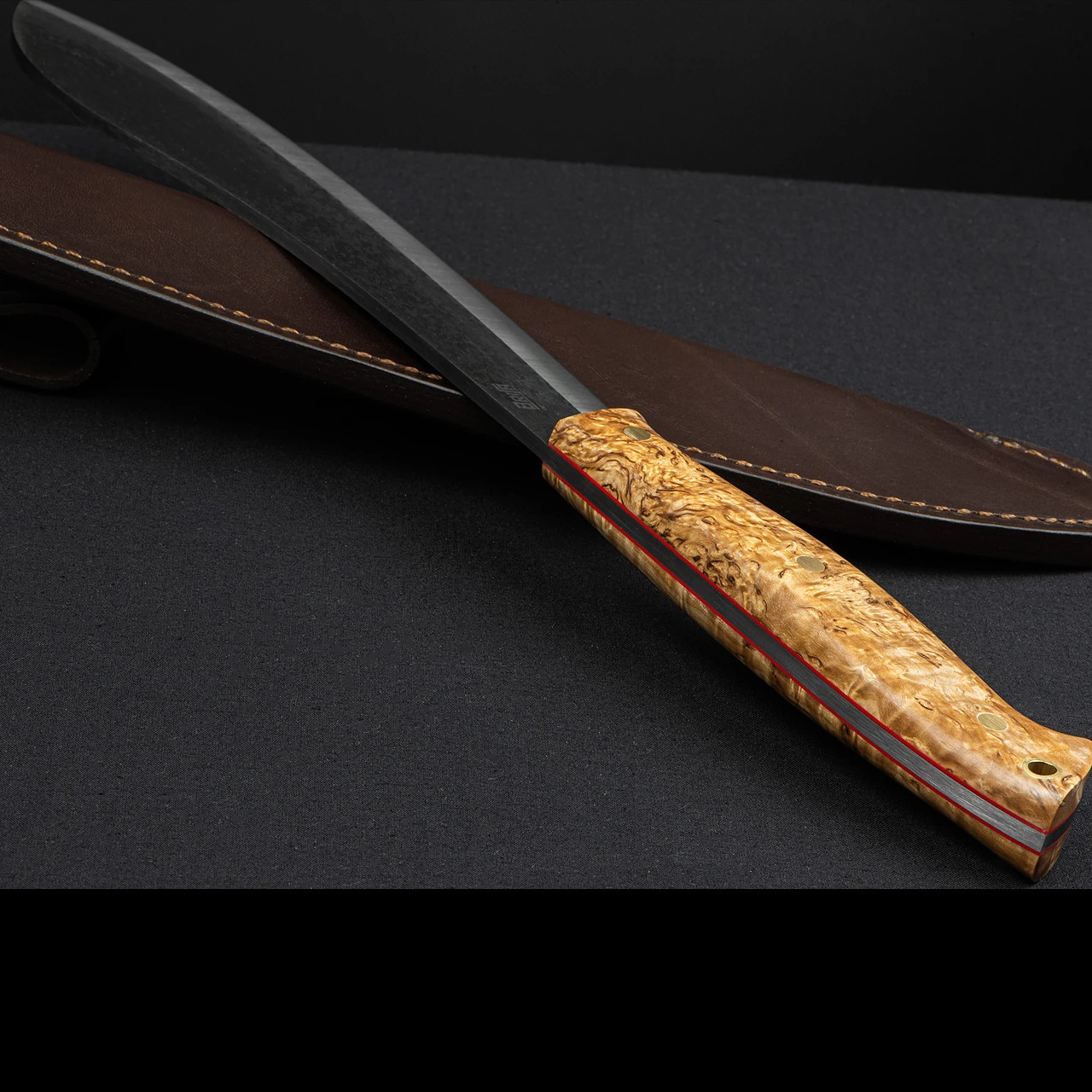 The handle is made from two pieces of stabilised curly birch and red liners that sandwich the exposed tang. They not only look very nice but provide a comfortable grip for long periods of use.