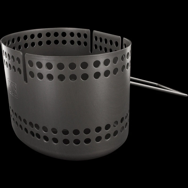 An intergral folding arm allows a Crusader Cup Canteen (sold separately) to fit securely over gel fuel or solid fuel blocks. The holes in the cooker base are designed for efficient air intake whilst the walls of the cooker provide shielding against the wind. In transit the cooker will nest neatly and compactly beneath the cup.
