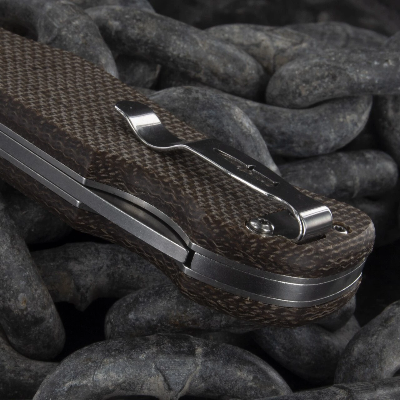 The Camillus Bushcrafter Folder is the knife built for long term use in the wilderness. The drop point blade is titanium bonded, the Micarta handle scales are removable with hex bits, the knife has a dual position belt clip and has a simple lockback.Â