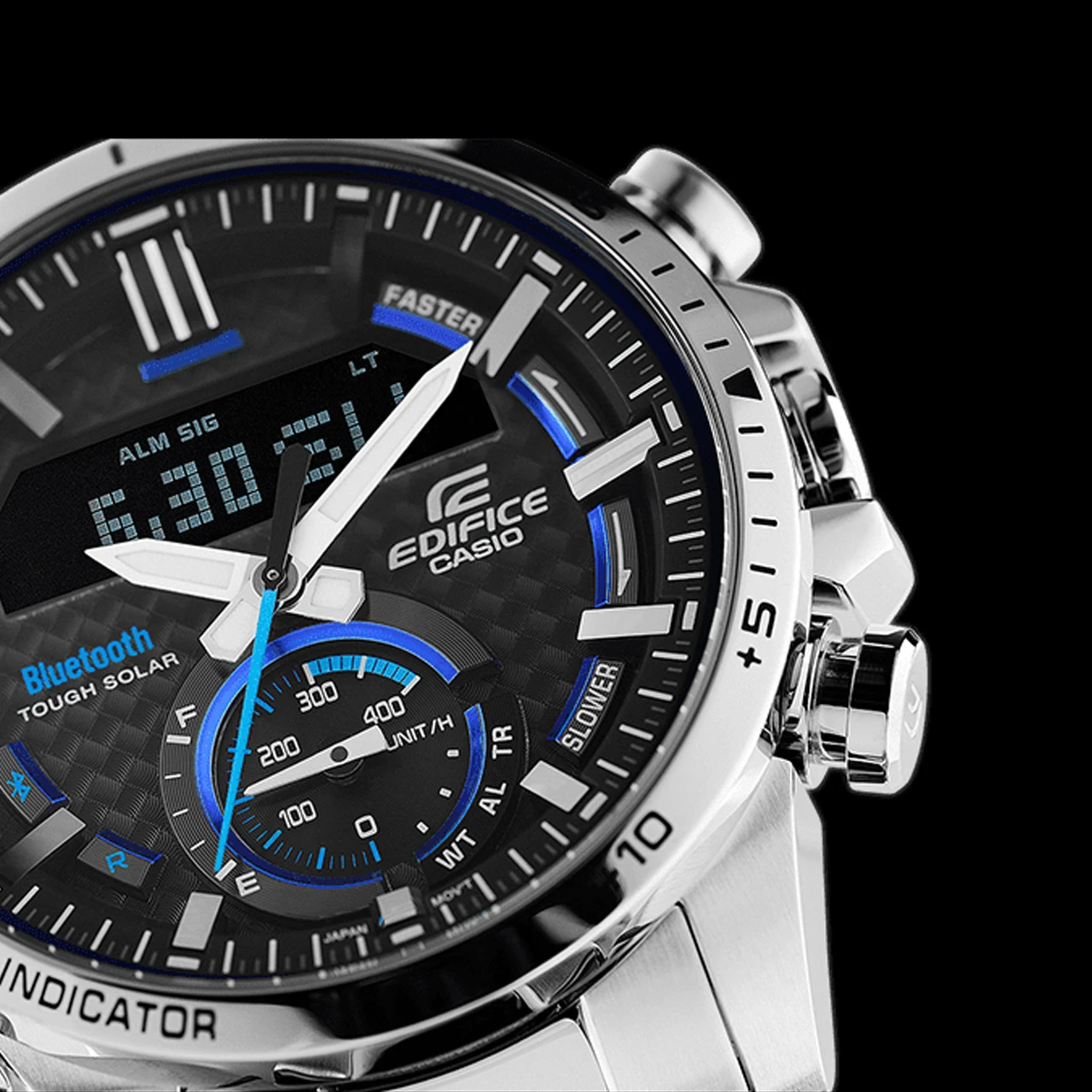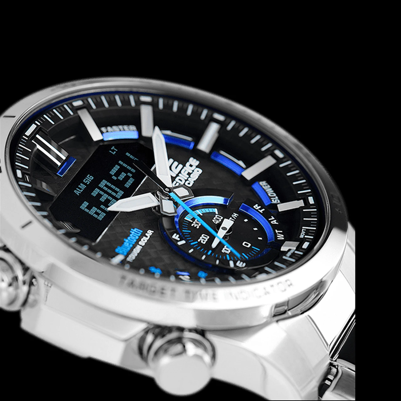 A 1/1000-second stopwatch comes with memory for 200 lap time records, while a large full-dot LCD can be used to view the actual value of each lap as well as a graphic representation of multiple laps. A target time indicator shows the relative difference between a lap time and a target time set with the EDIFICE Connected phone app, for instant intuitive feedback.