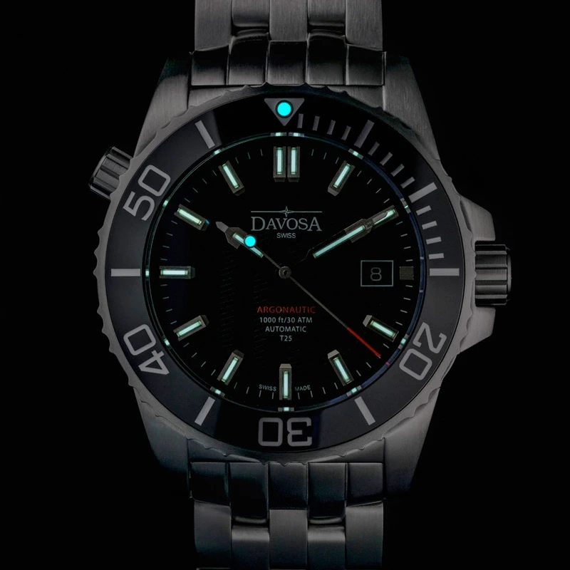 These ensure sustained luminosity without any drop in intensity – even in complete darkness, without an external energy source. This makes the Lumis models particularly suited for use in very poor visibility, both in and above water. The Davosa Argonautic Lumis T25 model also possesses this characteristic feature. However, the following details have been remodelled in comparison to its predecessor: