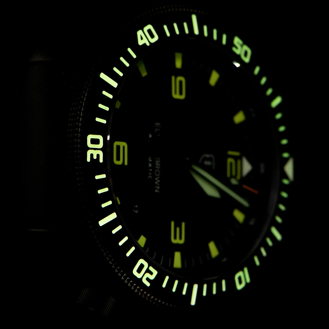 - Superb night time performance with ultra bright Superluminova dial and bezel