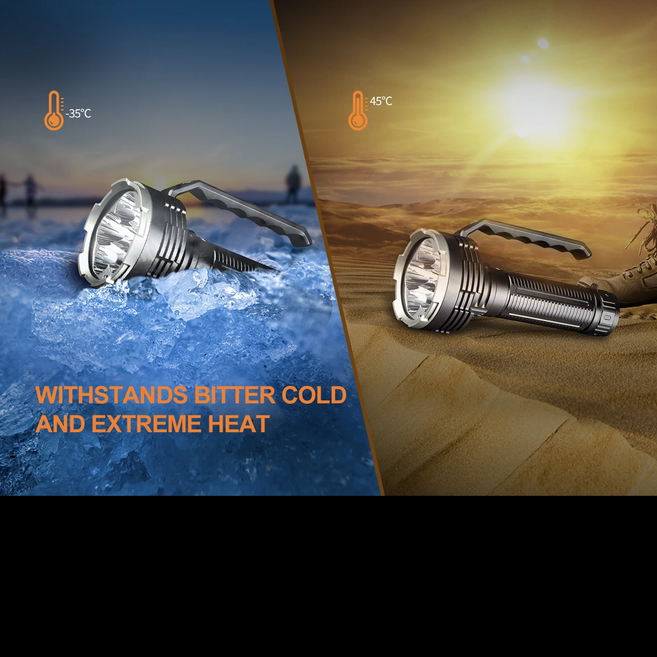 18,000 and 12,000 lumen temperature regulated boost modes provide incredible combined distance / area lighting when you need it, whilst constant outputs of 50 lumens (12.5 days), 450 lumens (39 hrs), 1000 lumens (15 hrs 40 min), 3000 lumens (5 hrs 10 min) and 6000 lumens (2 hrs 50 min) take advantage of the large battery capacity and torch cooling area to deliver massive run time performance.
