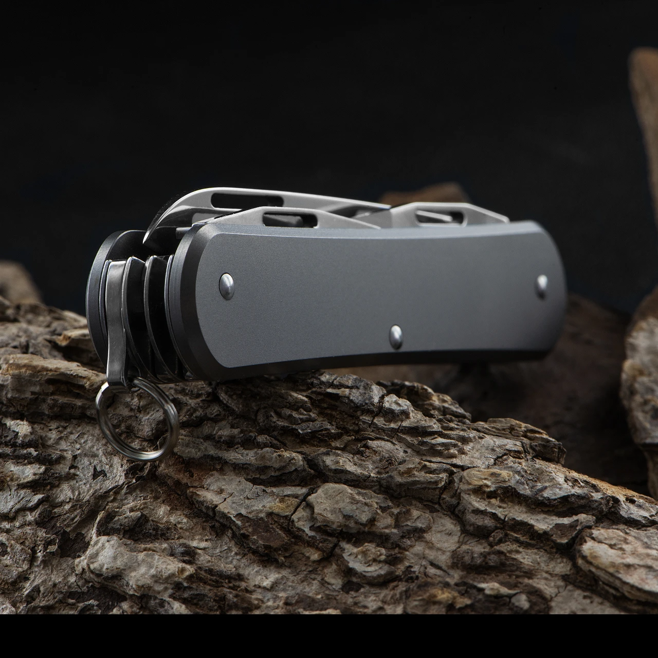This version uses a lightweight and seriously strong Titanium handle and has three tools in addition to the stout little sheepsfoot blade. There’s a saw, a can opener with screwdriver and a bottle opener with screwdriver. Pop one on your keys with the keyring attached and go about your day!