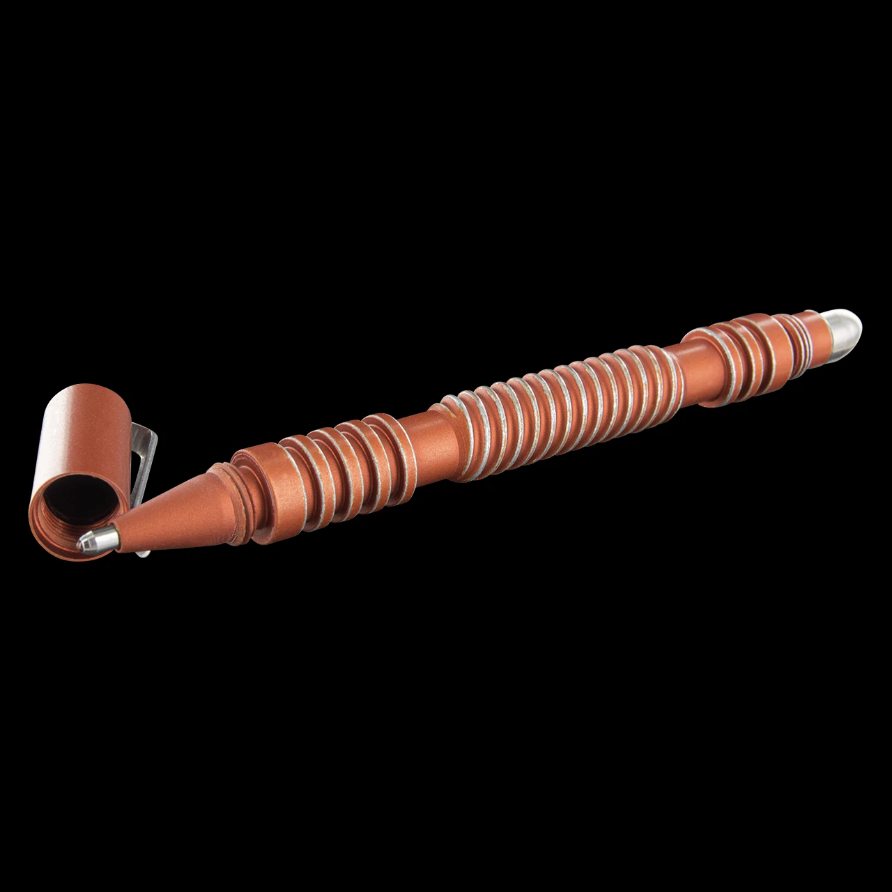 When knife designer Rick Hinderer turns his attention to creating a tactical pen you can be sure that it has the same uncompromising design and attention to detail as his outstanding knives. The Investigator is a compact little EDC pen with an enormous amount of attitude! This version is made from Aluminium with a “Battled” orange surface giving a very cool used and abused look.