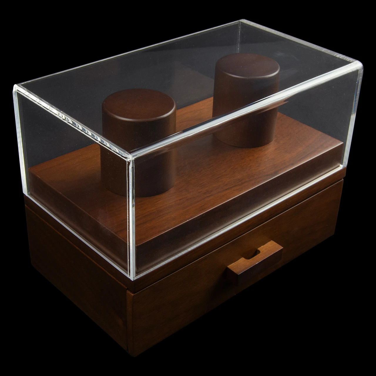The double watch box has a walnut finish and a thick perspex case. There is also a drawer to store some of your EDC valuables.