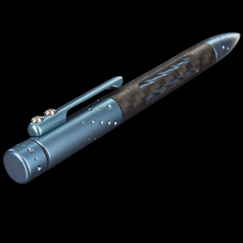 The Nyala Carbon Fibre Blue Matt uses the best quality materials to make a writing tool you will never tire of using. The body is made entirely of blue anodised Titanium with a skeletonised insert of carbon fibre. The pen tip is engaged using a twist mechanism and uses a Fisher Space Pen refill which will write upside down, in the wet and in space!