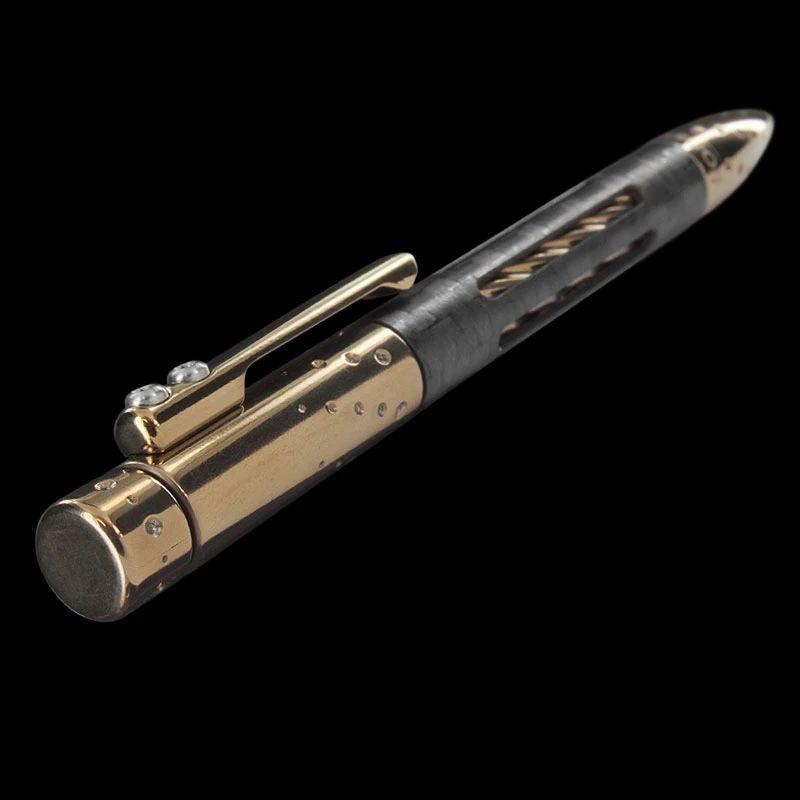 The Nyala Carbon Fibre Titanium Bronze uses the best quality materials to make a writing tool you will never tire of using. The body is made entirely of bronze anodised Titanium with a skeletonised insert of carbon fibre. The pen tip is engaged using a twist mechanism and uses a Fisher Space Pen refill which will write upside down, in the wet and in space!