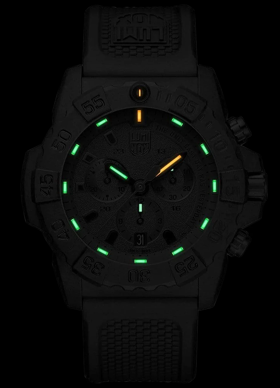 The Navy SEALs motto “The Only Easy Day Was Yesterday” in red sets an unmistakable accent on the black-in-black dial. Equipped with the proven Luminox Light Technology