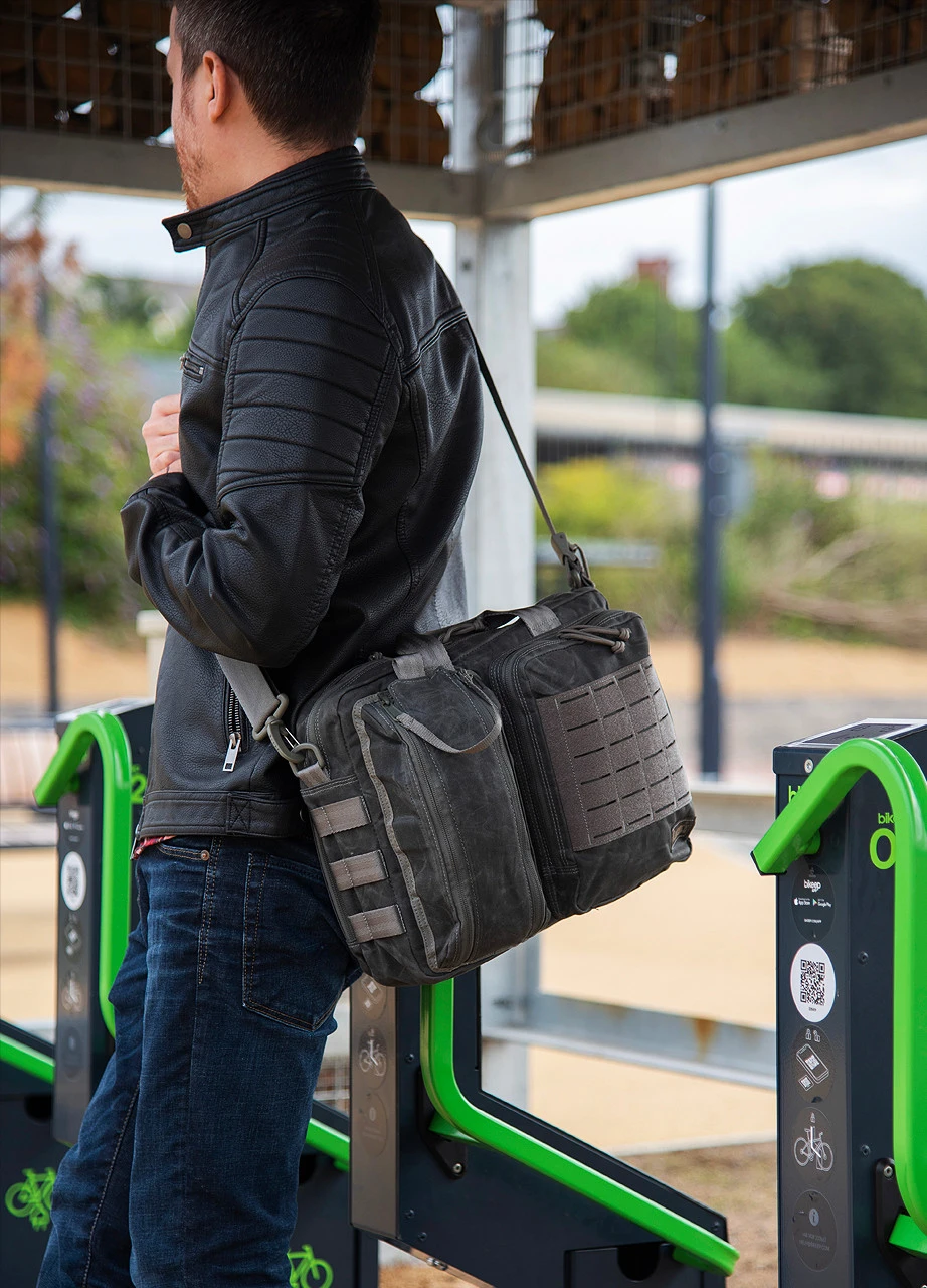 It is supplied with a detachable strap and can be worn on either side of the body and with either side facing outwards. One side features two zippered pockets, a bottle holder compartment with elasticated loops and a wider pocket with MOLLE panel and three internal sleeves. The main compartment has two hook and loop surfaces and a padded laptop sleeve measuring 30 x 26cm. The rear zippered sleeve has a hook and loop surface and two separate sleeves this area is ideal for folders, books etc.