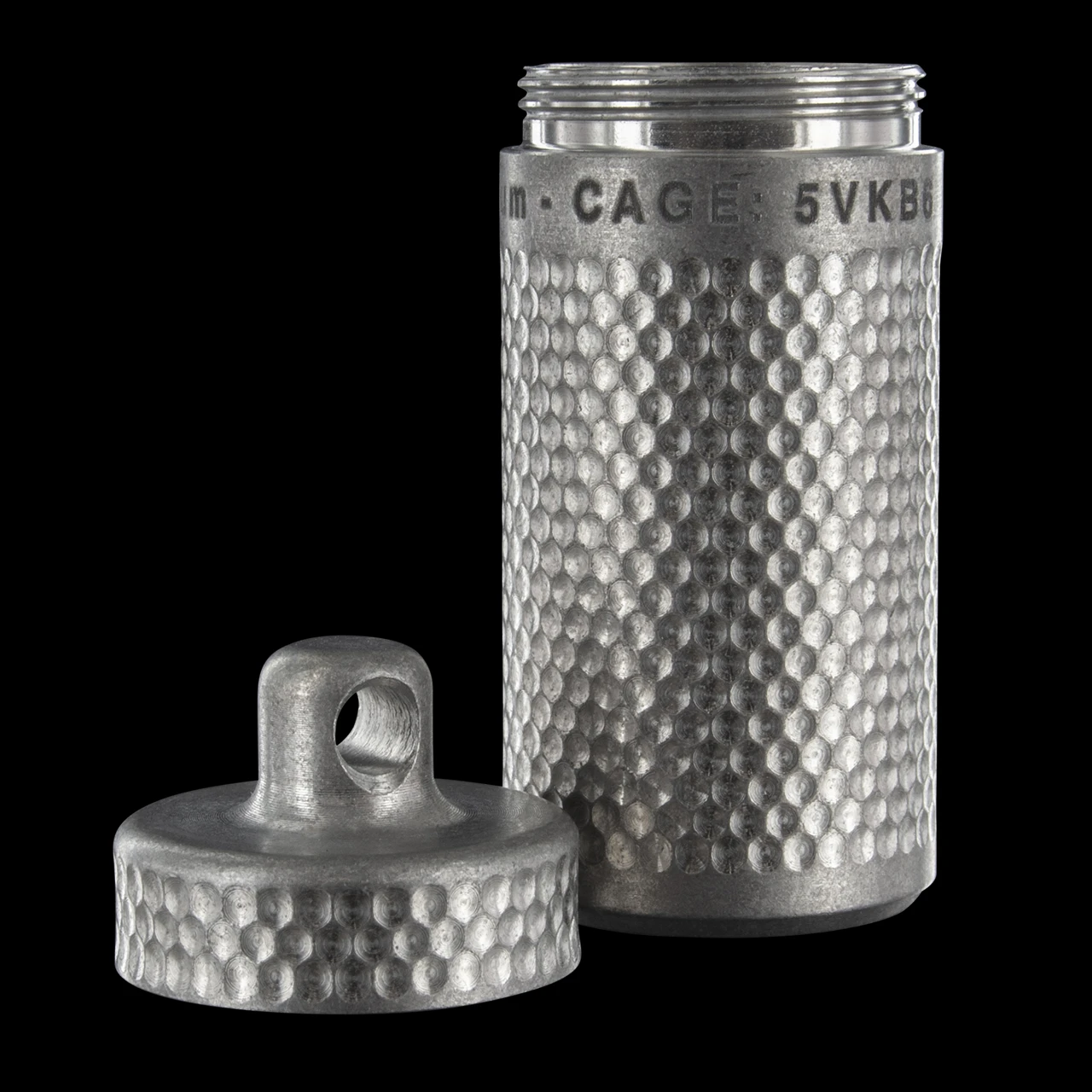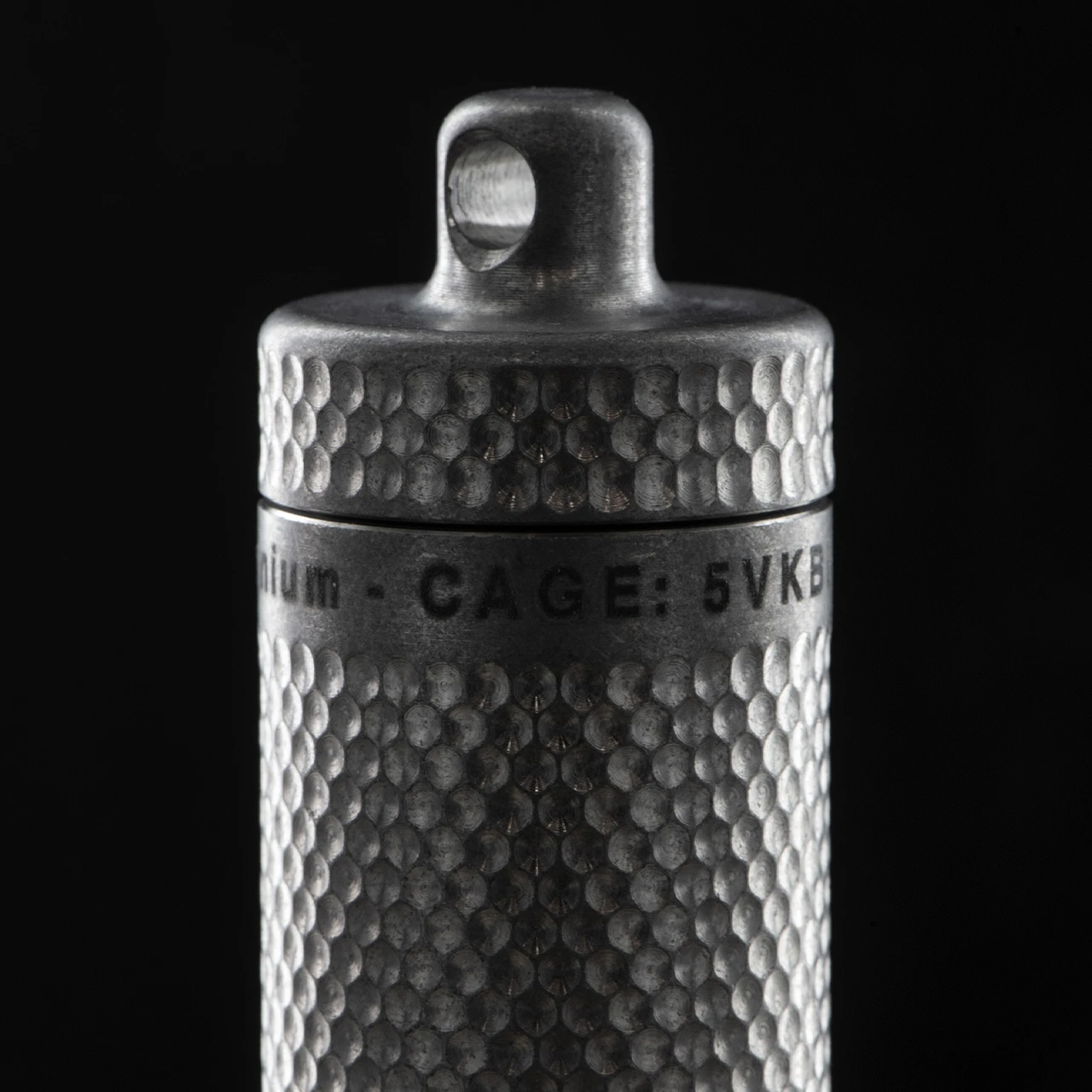 The Maratac Piccolo Nitro Vault XL is a super tough, super lightweight capsule made from Titanium. The lid screws on and off and is sealed with a rubber o-ring to keep the contents dry.