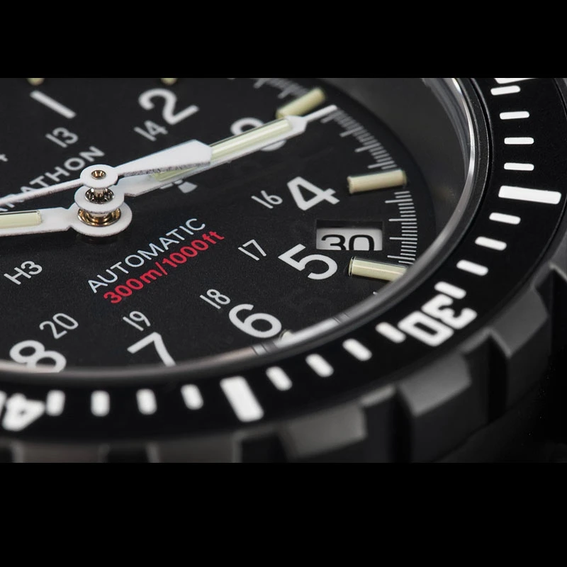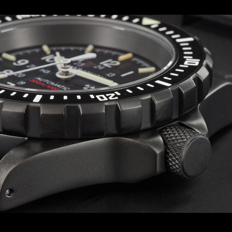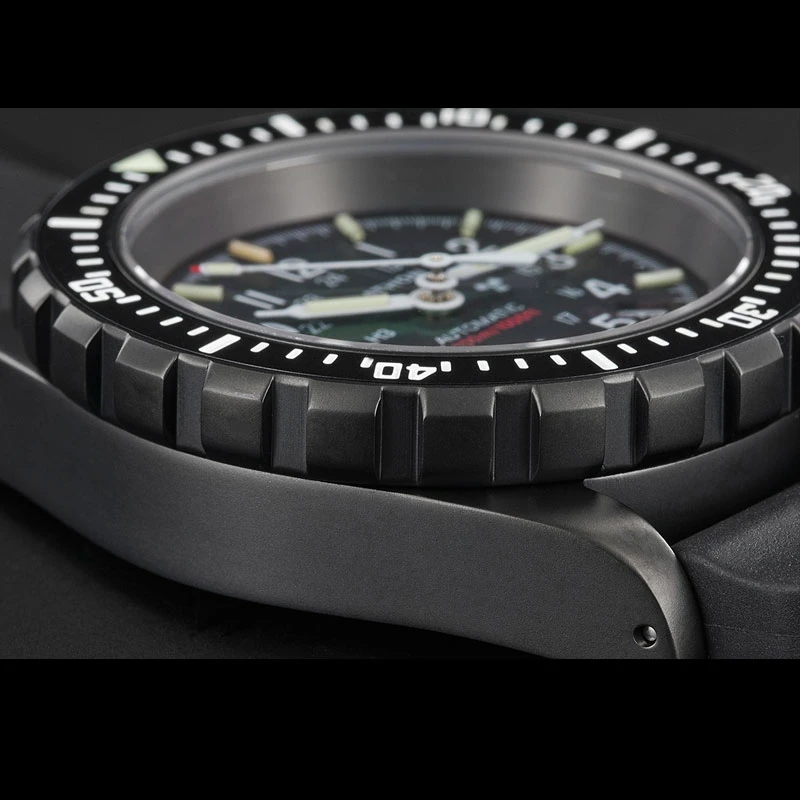 The Diver’s Automatic uses self contained Tritium gas tubes to ensure constant visibility in low light situations. A gas tube is placed on each hour marker, each hand and uses MaraGlo for the 12 hour bezel marker. Tritium tubes are self illuminating gas tubes which contain an isotope of hydrogen, meaning they will not dull down in brightness like normal photo-luminescent paint which requires an external light source to create a glow.