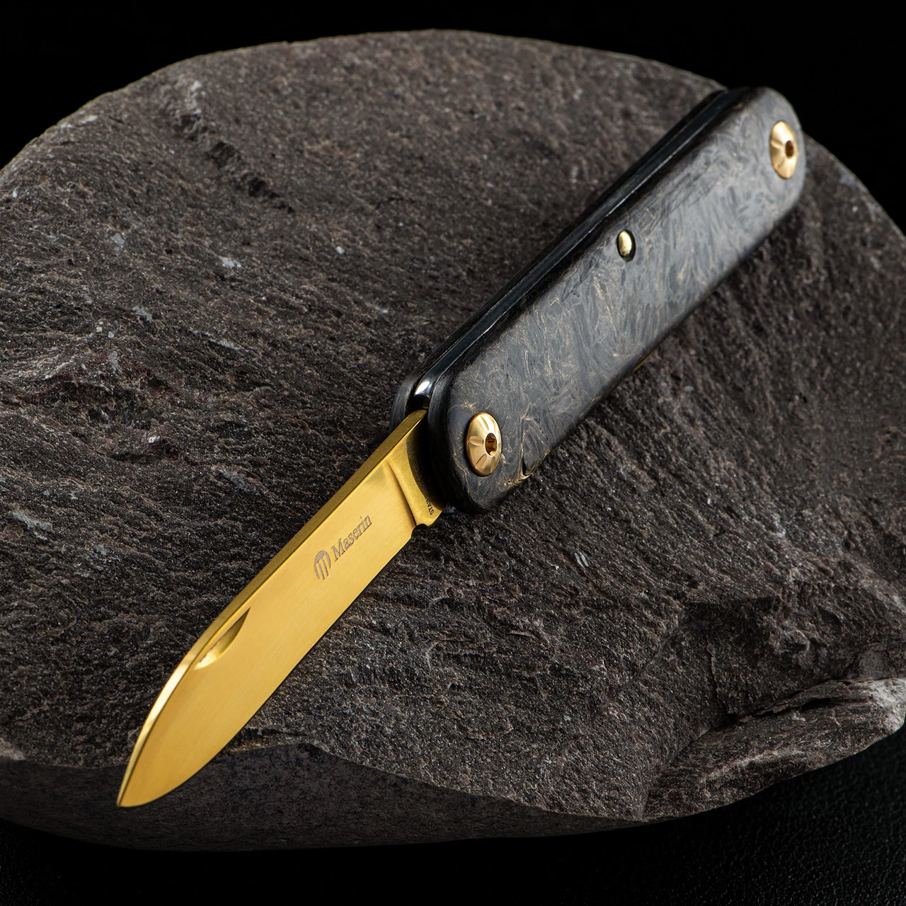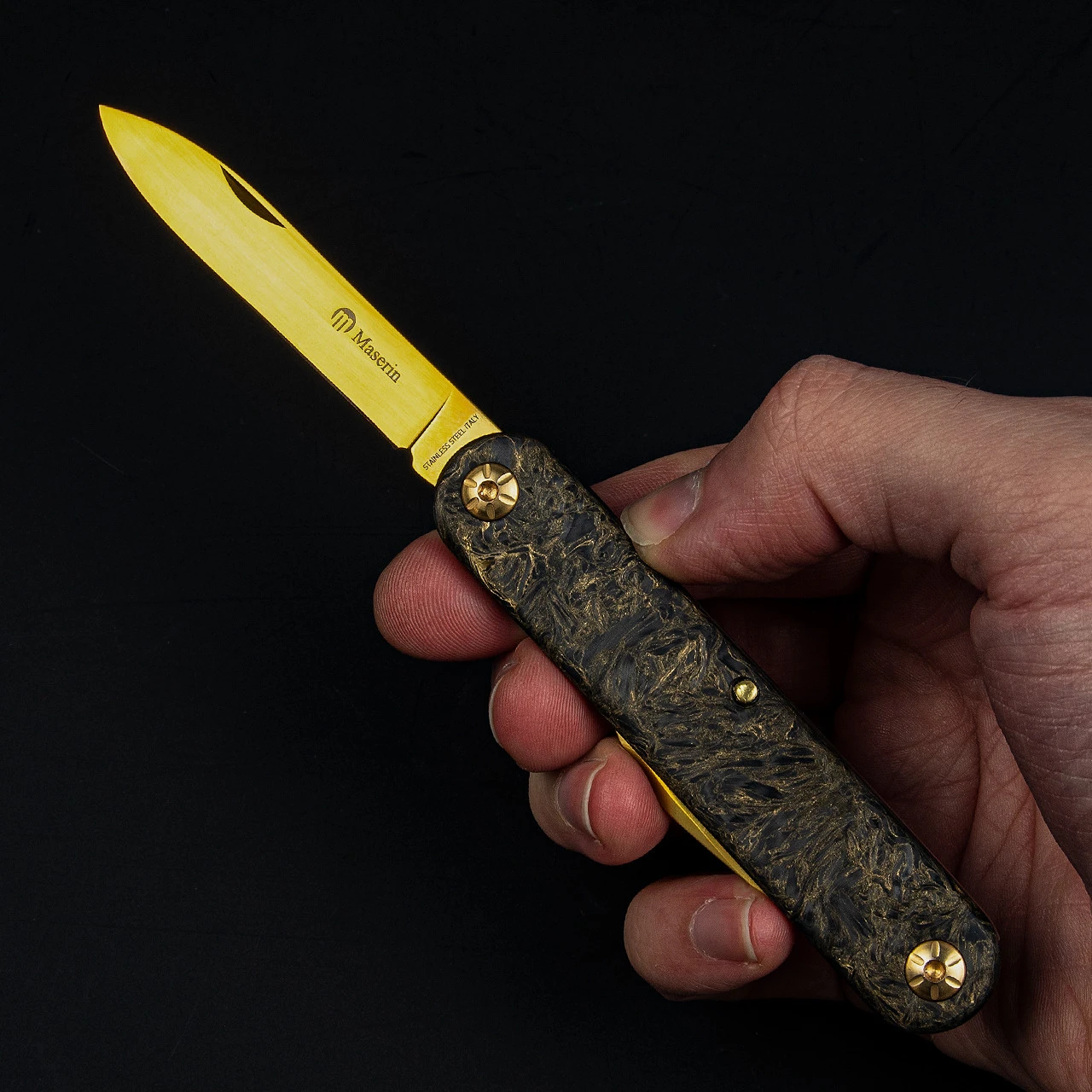 The curious name here comes from the “Super Titanium Nitride” blade coating. Maserin’s technology has allowed the blades of the knife to be coated with a titanium nitride finish, which in practice gives an incredibly refined golden lustre to the blades. In use, this coating bestows a very strong resistance to corrosion and abrasion and a very high surface hardness.