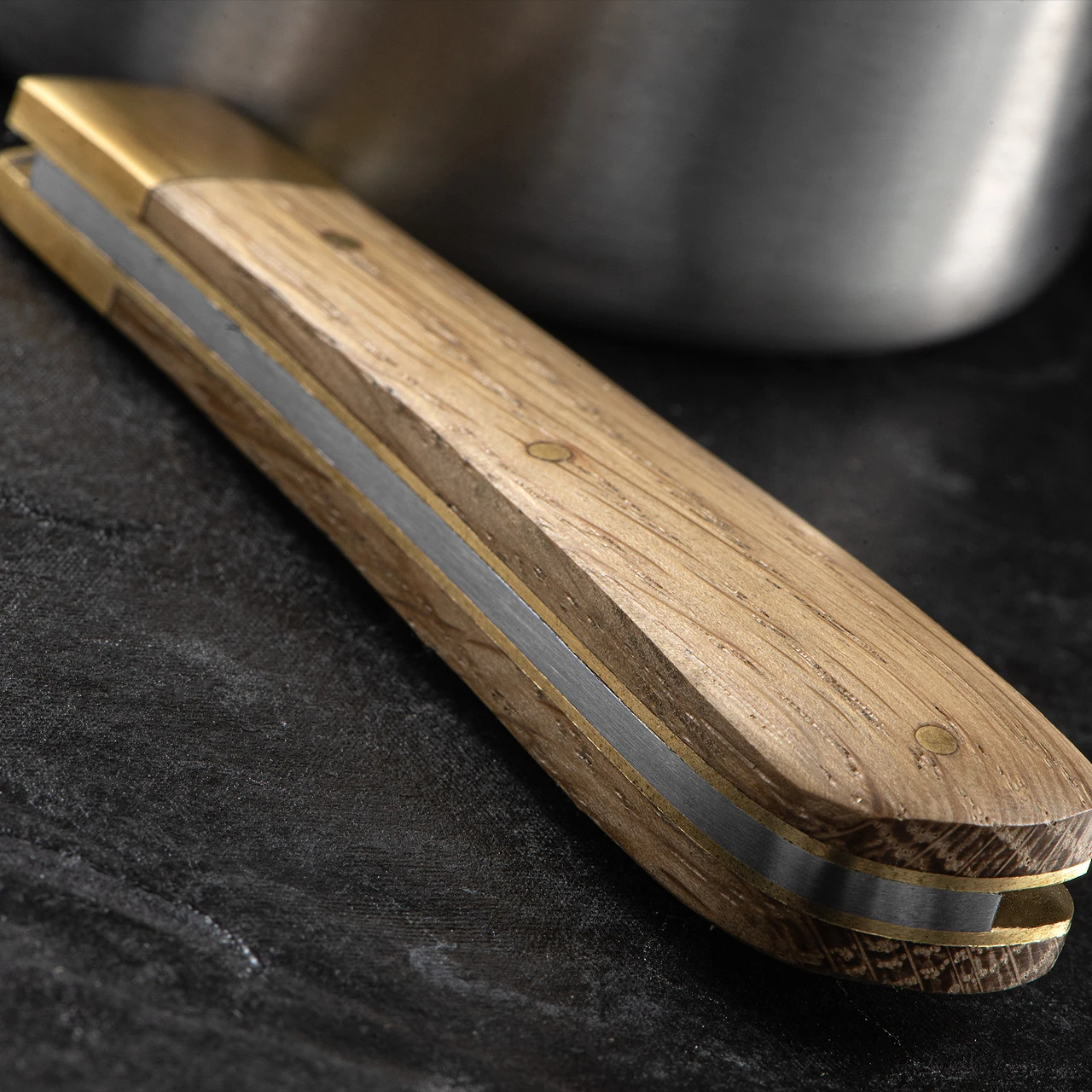The Michael May Lambsfoot Oak is a stunning little folder with a traditional Lambsfoot blade made from O1 carbon steel with a thumb nick for opening. The impressive handle is made from locally sourced Yorkshire Oak wood scales with a brass bolster.