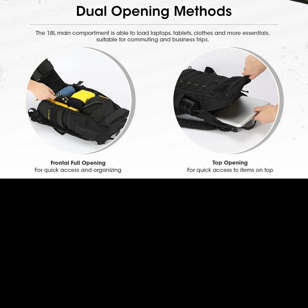 The main compartment is able to store laptops, tablets, clothes and other essentials. The interior is highly functional and includes a 14″ laptop/tablet compartment with cotton cushion, frontal interior hook surface for modular extensions, dual side interior pockets for small gadgets and a hanger for a hydration pack (not included).