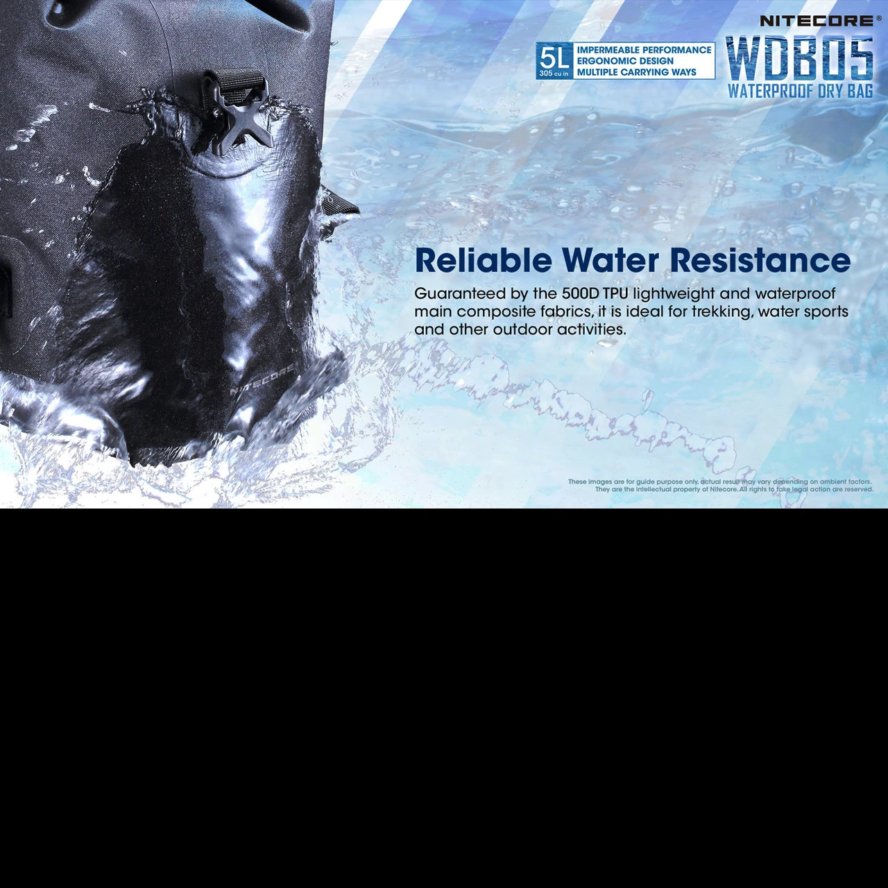 The Nitecore WDB05 is a 5L waterproof dry bag, designed for trekking, water sports and other outdoor activities. The bag features excellent impermeable performance, ergonomic design and multiple carry options.