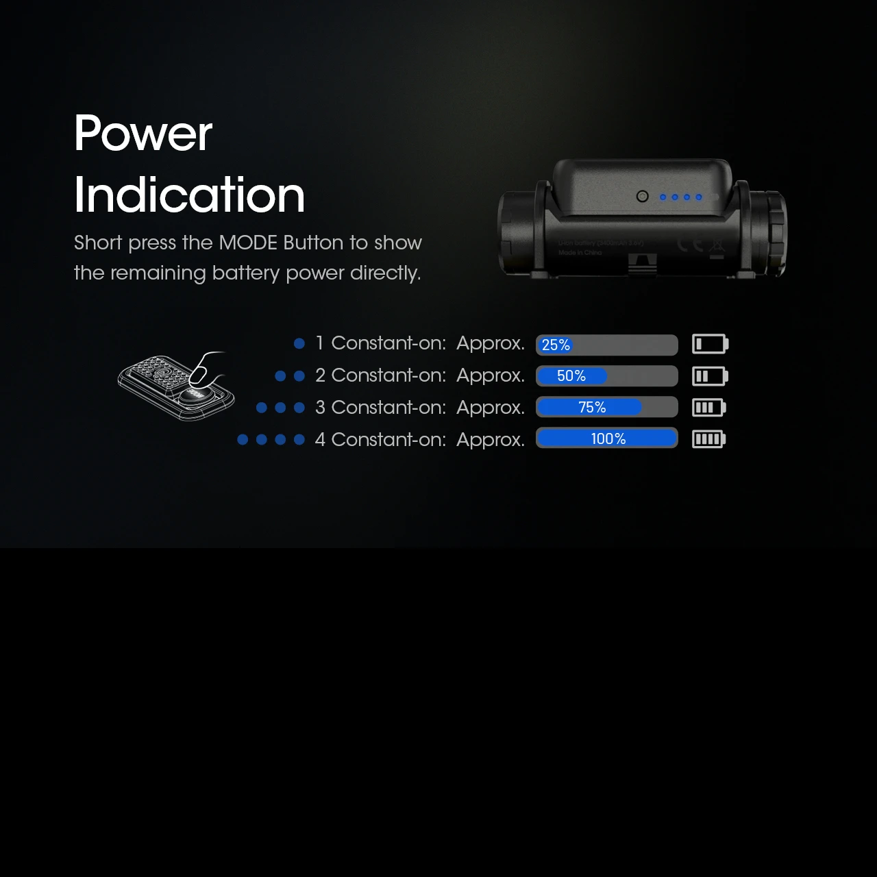 - Red flashing: 10 lumens – 90 hrs runtime