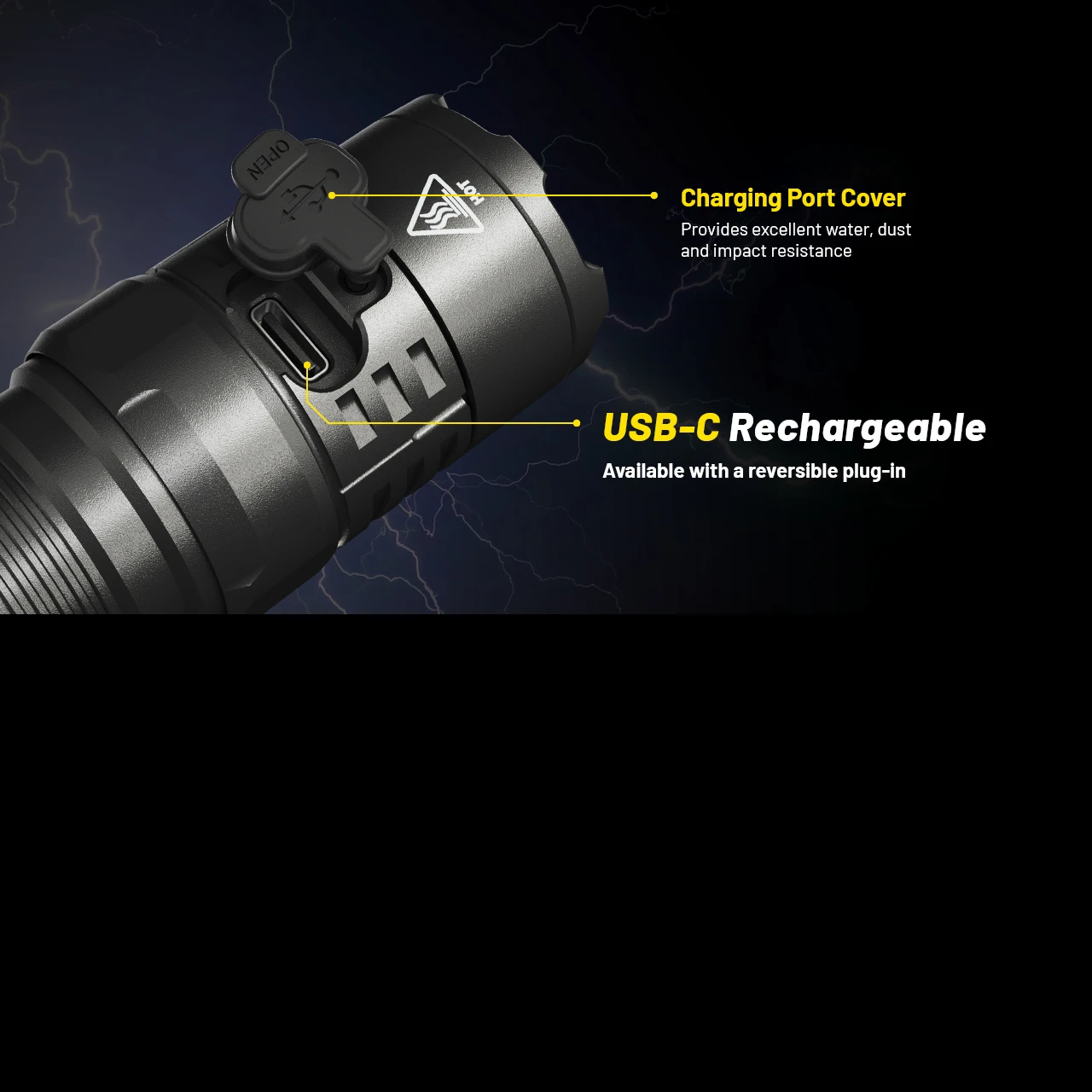 The Nitecore P23i flashlight has a maximum output of 3000 lumens from the Luminus SFT-70 LED and is powered by an included NL2150HPi iSeries 21700 battery. The light is rechargeable via a USB-C port at the head of the light and comes with a USB charging cable.
