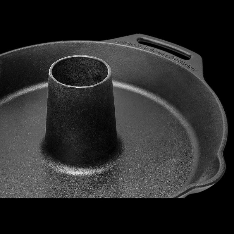 A chicken, quail or small duck will be prepared very easily with the Petromax Poultry Roaster CF30. Placed on the cast-iron roaster, the poultry will be evenly cooked thanks to the optimal heat distribution design. While the meat is sizzling in the oven or on the grill, surplus fat and meat juices will flow into the drip pan. The poultry will thus gain a delicious and crusty skin outside and thanks to the hole filled with spices, herbs and stock also a great flavour inside. It is a simple design perfectly suited to outdoor cooking. The valuable properties of the material, as well as the pre-seasoned surface (seasoned finish) together with the natural non-stick effect, round off the easy use of the cast-iron roaster