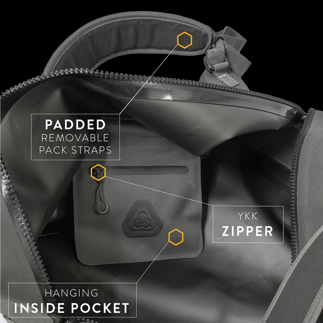 The Prometheus All Terrain Duffel 45L is rated to IPX7, features a robust, Delrin tooth and a waterproof main zipper to access the main compartment to keep your load out dry. An additional internal hanging zippered pocket keeps those smaller items quick and easy to access. It is constructed of 1000D RPET (eco-friendly recycled polyester fibers) with fully welded seams. Rain or shine, land or sea, this duffel is truly all terrain and ideally suited for amphibious adventures, overlanding in any weather, rainy days, life in the PNW, packrafting, fly fishing, scuba, canyoneering to island hopping and more.