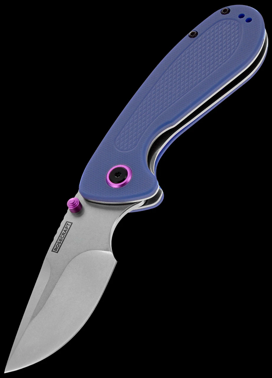 The RoseCraft Pocket Monster features a 7.0cm (2.75”) drop point blade with a stonewash finish. It opens via a ceramic ball bearing pivot so feels extremely smooth and has a large ricasso where you finger can sit for fine control during use. It features attractive blue G10 handles with a purple pivot collar and ambidextrous thumb studs. Proudly designed by Savannah “Swaggs” Swaggerty.