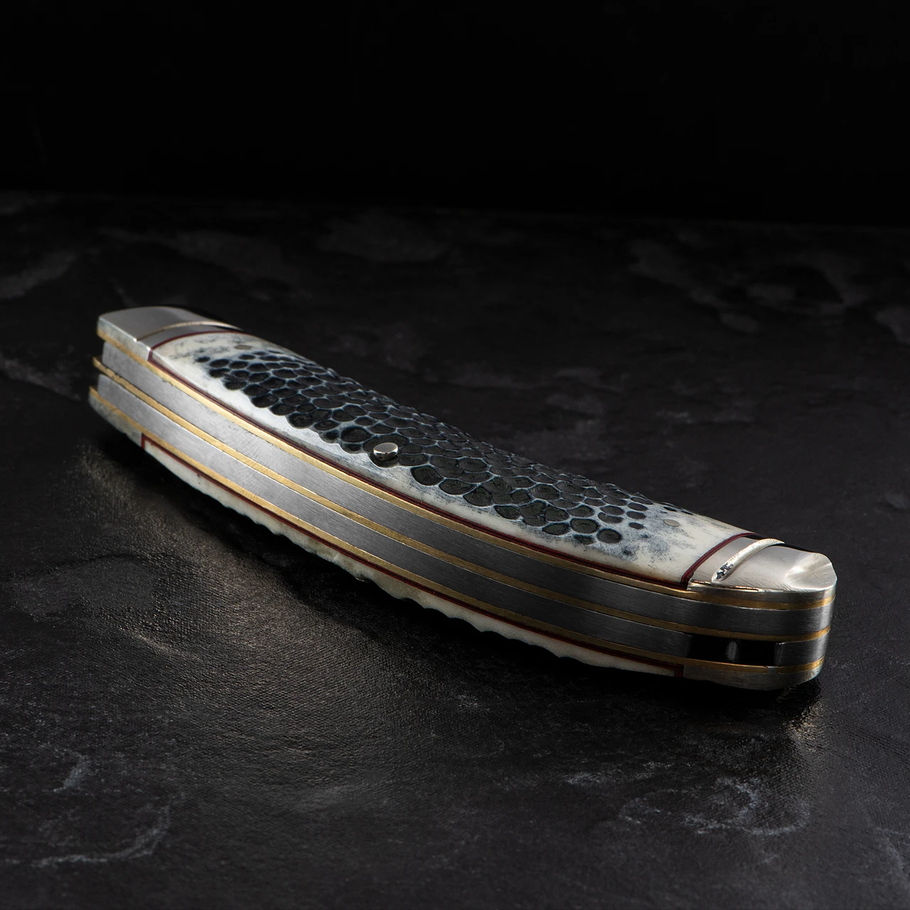 The Rough Rider Bow Trapper Buckshot Bone features two blades; one clip point and one spey. Both have a cutting edge under 7.6cm and both are non-locking so the knife is classed as UK friendly carry. Red dividers, brass liners and nickel silver bolsters finish off what is an impressive looking and highly practical knife