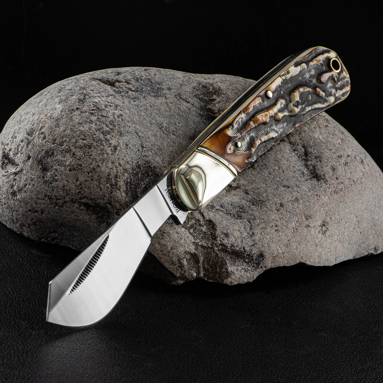 The blade is carbon steel whilst the handle is Cinnamon bone stag with nickel silver bolsters. The blade is non-locking with a cutting edge under 7.6cm long making it a UK friendly carry knife.