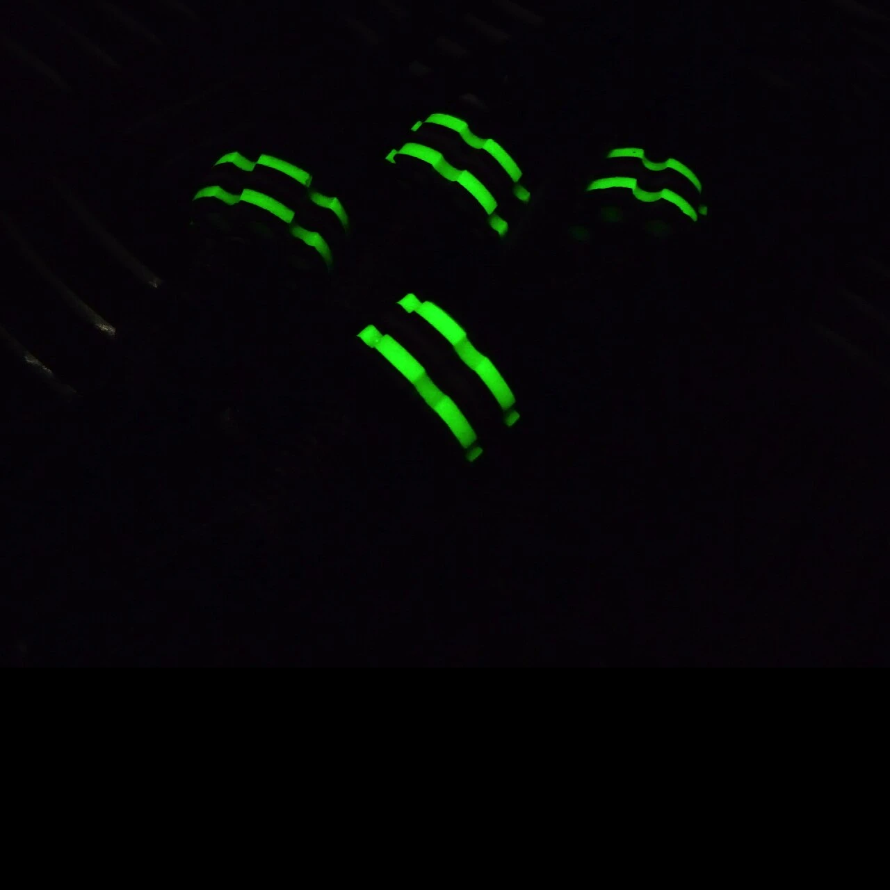 - Antiqued steel outers, green glow and G10 liners