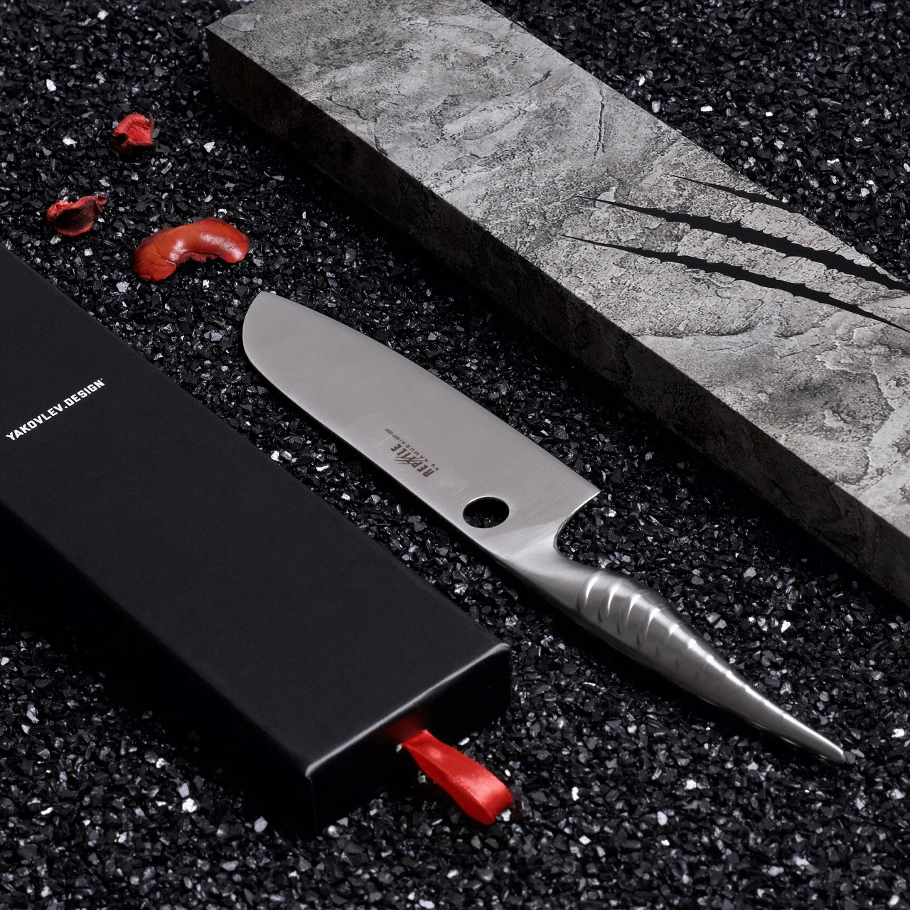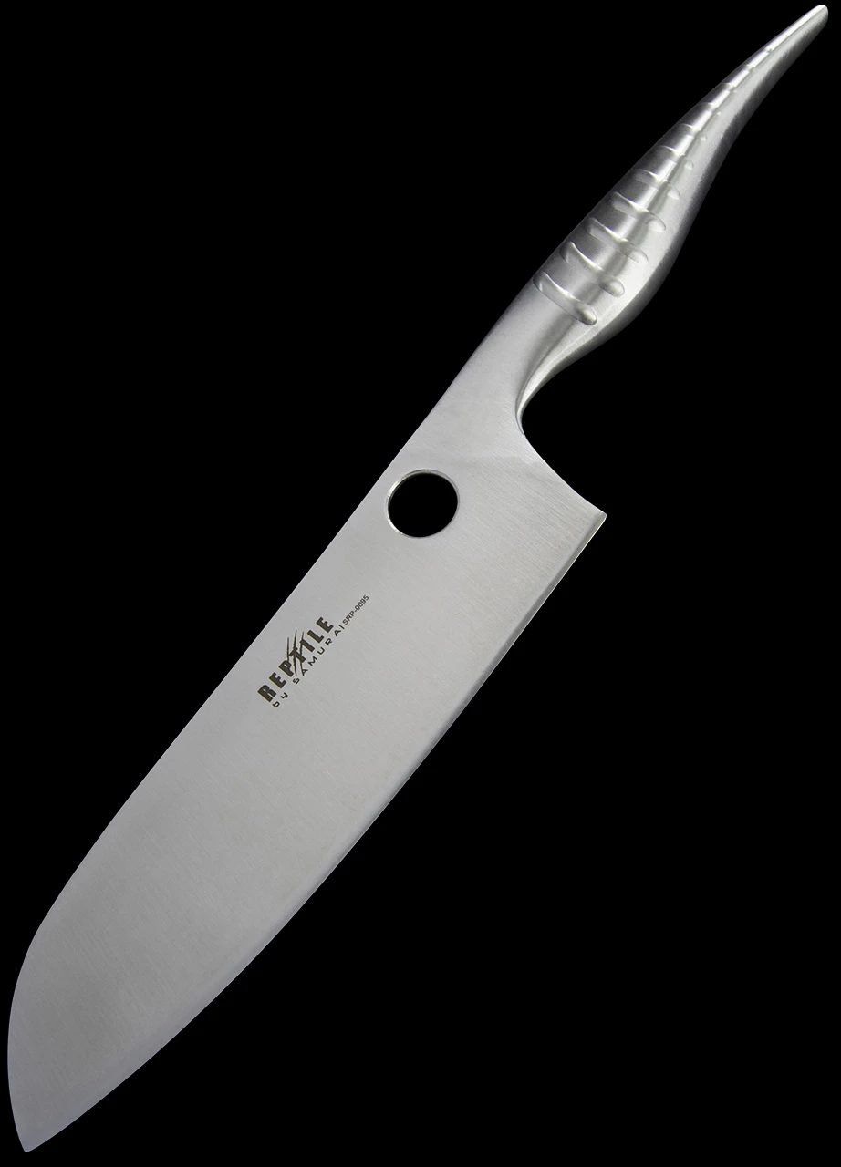 The Samura Santuko Reptile benefits from a AUS10 stainless steel, stain resistant blade. The handle is stainless steel too in a “reptilian” design which will fit right into the kitchen of veggies and meat-eaters alike.Â
