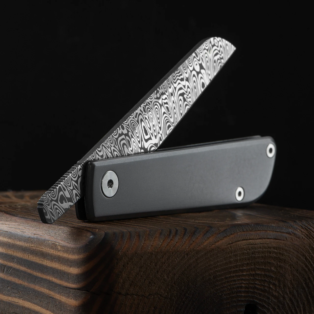 This version has a Titanium handle and stunning Damascus steel blade. It has no lock and instead relys on pressure during use to hold the blade in place. It is therefore a UK legal carry knife.