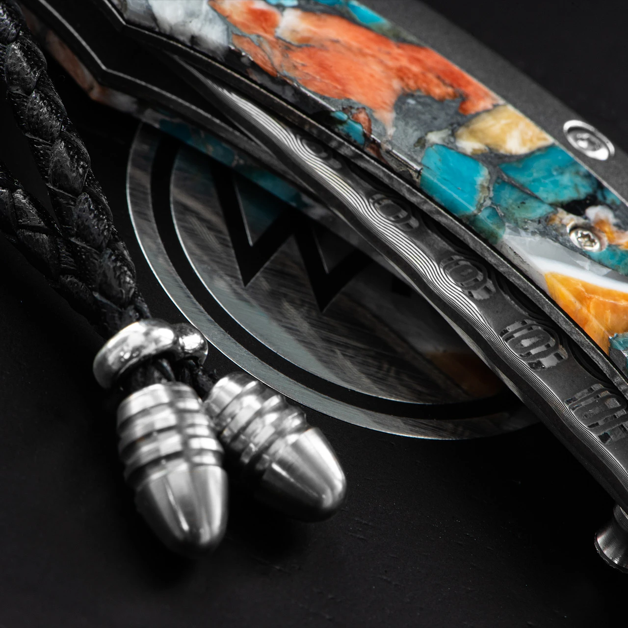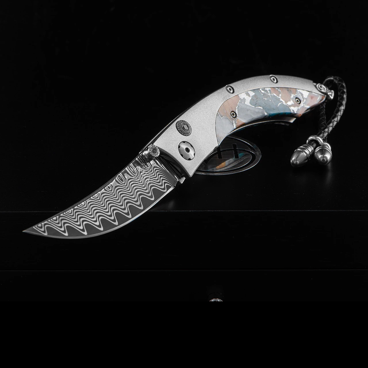 The William Henry Persian ‘Breeze’ features a light and resilient frame in aerospace grade titanium, inlaid with spiny oyster & turquoise. The blade is ‘Wave’ Damascus with an extra strong core of VG-10. The one-hand button lock and the thumb stud have been set with fine white topaz gemstones.